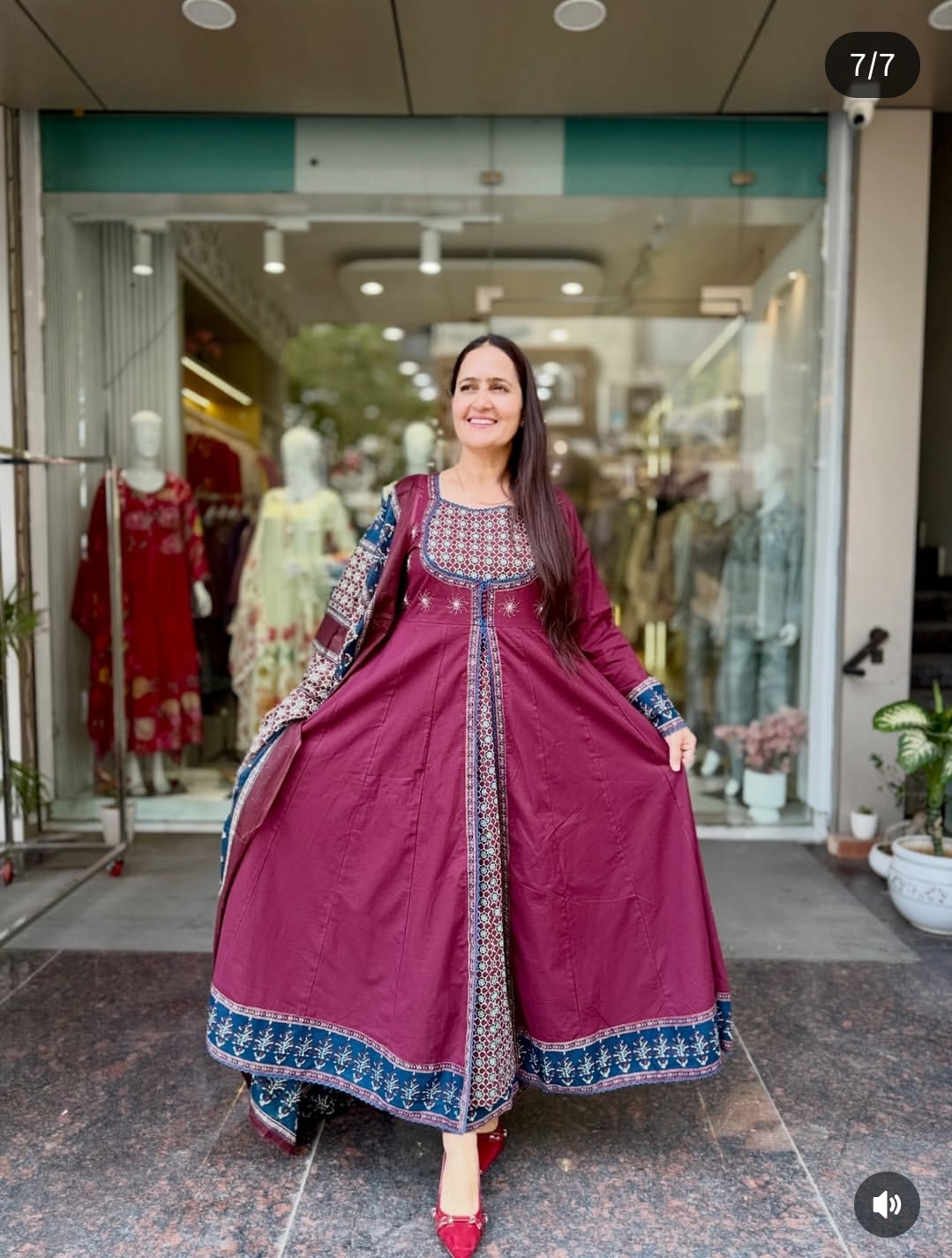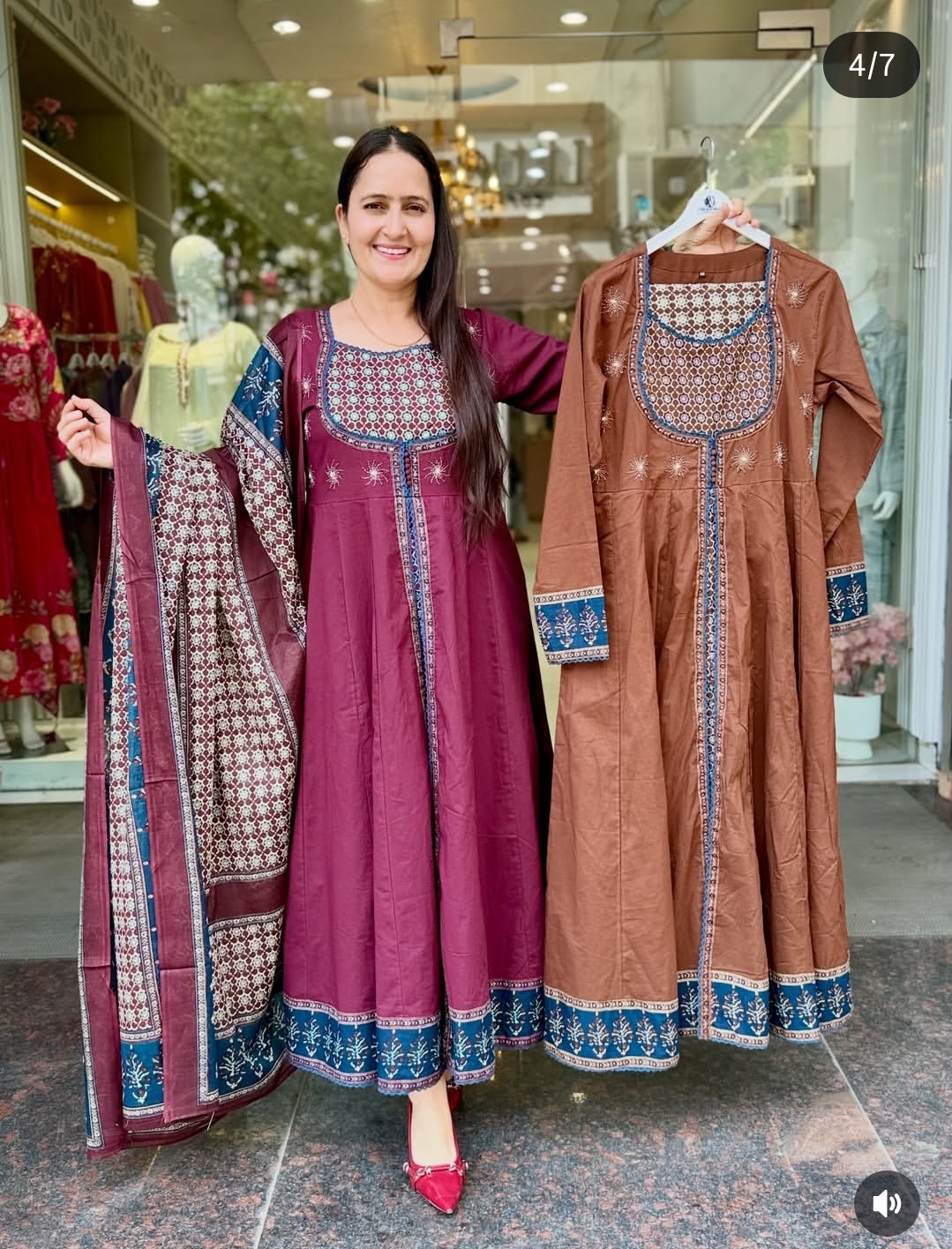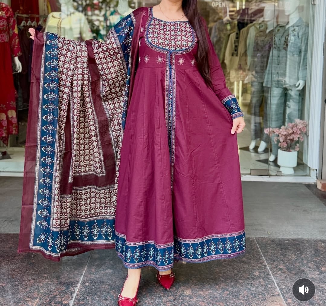 This elegant Anarkali suit in rich brown and red tones is crafted in pure cotton, offering a graceful flow with all-day comfort; we focus on breathable fabric, a flattering flared silhouette, and timeless color contrast to create a look that is both traditional and versatile, making it perfect for festive occasions, casual gatherings, or refined everyday wear while ensuring effortless style and ease.
